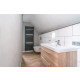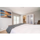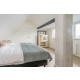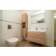 Das Hauptschlafzimmer im Erdgeschoss hat ein Doppel Boxspringbett (160x200) und einen Kleiderschank. Das angrenzende, moderne Badezimmer ist mit einer Regendusche, einem Badmöbel und einer Toilette ausgestattet. Im Flur befindet sich noch eine separate Toilette.