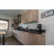 Die moderne, offene Küche mit angrenzendem Essbereich ist mit Gaskochplatte, Kombi-Mikrowelle, Geschirrspüler und Kühlschrank ausgestattet. In der Waschküche befinden sich ein Gefrierschrank und eine Waschmaschine.