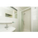 Das Badezimmer hat eine Dusche und ein Waschbecken. Es gibt eine separate Toilette.