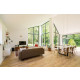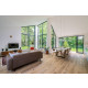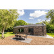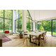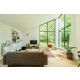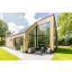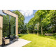 Das Haus hat schöne, hohe Fenster bis zum Dachfirst, die das Wohnzimmer hell und geräumig erscheinen lassen. In diesem Raum gehen Innen und Außen nahtlos ineinander über. Man kann sich hier daher das ganze Jahr hindurch wohlfühlen. Vom sehr geschmackvoll eingerichteten Wohnzimmer aus blickt man auf allen Seiten in eine grüne Oase. Die gemütliche Sitzecke verfügt über SMART TV (u.a. mit NETFLIX) und eine Stereoanlage (Marantz).