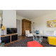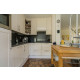 In der modernen, offenen Küche befinden sich unter anderem ein 4-Brenner-Gaskocher, ein Geschirrspüler, ein Kühlschrank mit Gefrierfach und eine Kombi-Mikrowelle.