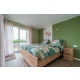 Das Wohnzimmer führt in das sehr große, geschmackvoll eingerichtete Schlafzimmer mit Doppelbett (zwei separate Matratzen, unabhängig elektrisch in Höhe verstellbar) und Schiebeschrank. Auch hier gibt eine Schiebetür Zugang zu der Terrasse. Das Schlafzimmer ist direkt mit dem Badezimmer (rollstuhlgeeignet) verbunden. Das Badezimmer ist mit einer Dusche, einem Waschbecken und einer Toilette ausgestattet. Im Flur des Hauses befindet sich noch eine separate Toilette.